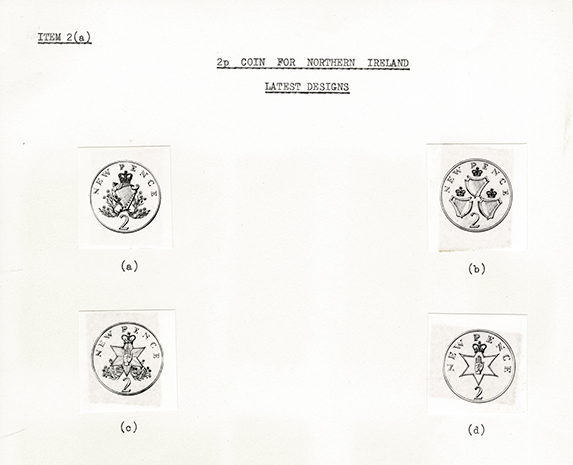 By mid-1970 the Mint was considering several design themes, though all posed formal or political problems, and sometimes both. Besides the Red Hand, the shield of the Northern Ireland government was proposed. Should either of them be crowned? Not doing so might bring loyalist objections, and potentially compromised the queen herself, while the crown risked provoking a nationalist political outcry. A further problem with the crowned shield was its visual unsuitability for a relatively small coin. The harp quarter on the royal arms seemed an obvious choice, but it was associated with Ireland as a whole and featured on all the Republic’s coin obverses. Meanwhile, the Northern Ireland government continued to demand the Red Hand ‘either on its own, or in combination with the star, crown and shield which were associated with it’ on the province’s coat of arms.