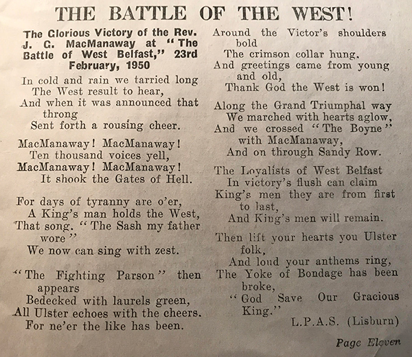 Above: ‘THE BATTLE OF THE WEST’, celebrating MacManaway’s victory in West Belfast in the 1950 general election. (The Unionist Voice)