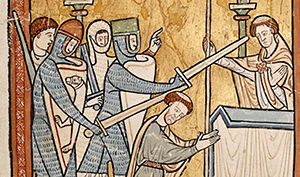 Above: Detail from a 1225 psalter depicting the martyrdom of Thomas Becket, the archbishop of Canterbury, by knights of King Henry II of England in 1170. Laurence O’Toole’s supporters compared him with Becket. (British Library)