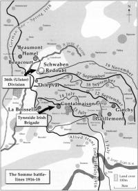The prevailing impression that only Ulster Protestants took part in the long-awaited ‘big push’ on 1 July 1916 is called into question by the participation of other Irish infantry units. The 1,000-strong battalion (at full strength), subdivided into companies and platoons, was at this time the basic administrative unit of the British infantry. There were four battalions in a brigade and three brigades in a division. In addition to the twelve battalions of the 36th (Ulster) division, were four battalions of Tyneside Irish (the 103rd brigade of the 34th division)—all ‘new army’—and seven regular Irish battalions distributed in other divisions, a total of twenty-three Irish infantry battalions in all.