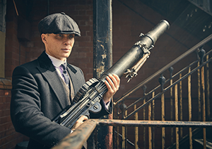 Above: Thomas Shelby (Cillian Murphy) toting a Lewis machine-gun, part of the consignment of weapons that the Blinders stole from the local BSA factory and which the authorities feared would fall into the hands of communists or the IRA. In fact, the IRA did try to steal weapons from Birmingham’s BSA factory.