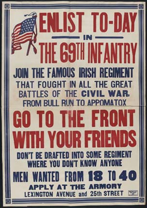 First World War recruitment poster for New York’s ‘Fighting 69th’ Infantry Regiment. After US entry into the war on Britain’s side in April 1917, the FOIF adopted a low profile. (Library of Congress)