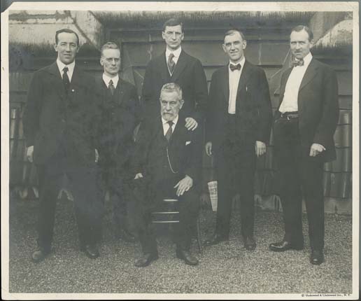 (left to right) Harry Boland, Liam Mellows, Éamon de Valera, John Devoy (seated), Dr Patrick McCartan and Diarmuid Lynch. Photograph taken on the roof of the Waldorf Astoria, 23 June 1919. (UCD Archives)