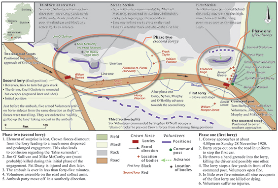 Above: Map detailing events during the Kilmichael ambush from data compiled by Mike Murphy from multiple primary and secondary sources, combined with site survey using Trimble GPS and GIS mapping equipment. (Atlas of the Irish Revolution, p. 410)