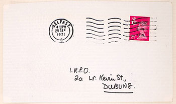 Above: An envelope bearing the overprinted ‘SUPPORT SINN FÉIN’ stamp, franked by the British Post Office and delivered to the ‘IRPO’ (Irish Republican Philatelic Office), an organisation that shared an address with the Dublin headquarters of Provisional Sinn Féin in Kevin Street. Such Post Office-franked envelopes were sold by the IRPO for the premium price of £2.