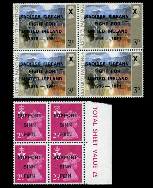 Above: Samples (top) of ‘Ulster ’71’ commemorative stamps overprinted with ‘SAOIRSE ÉIREANN FIGHT FOR UNITED IRELAND 1916–1971’ that appeared in June 1971, and (bottom) of stamps overprinted with ‘SUPPORT SINN FÉIN’ that appeared the following September.