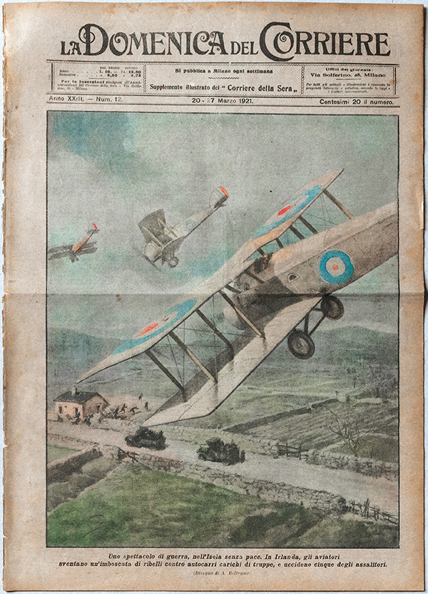 Above: An Italian Sunday newspaper depicts a fictitious attack by the RAF in Ireland: ‘The airmen foil an ambush by [IRA] rebels on trucks loaded with troops, killing five of the assailants’. Many foreign newspapers at the time followed British ‘spin’. (La Dominica del Corriere, 7 March 1921)