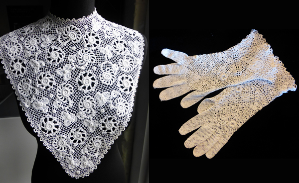 Above: Clones lace collar (left), c. 1900, maker unknown; lace gloves (right) by Julia Mowen (1885–1970).
