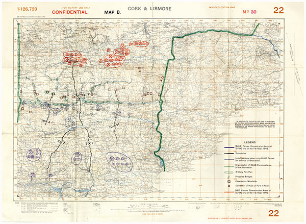 Above: A map of military manoeuvres by the Defence Forces along the River Blackwater in Cork, 1942. The location was chosen because nearby Cork Harbour was a likely area for a German amphibious assault, and the land to the east and north-east of the city was a good example of the terrain on which the Defence Forces would have to meet the invading German force. (Military Archives)