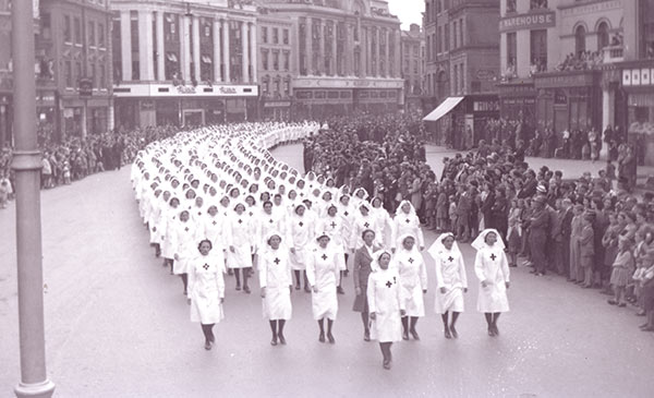 Above: Members of the Army Nursing Service parade through Patrick Street, Cork, on the conclusion of the Blackwater exercises in September 1942. The Irish government made a point of securing public support for its policy of neutrality. (Military Archives)