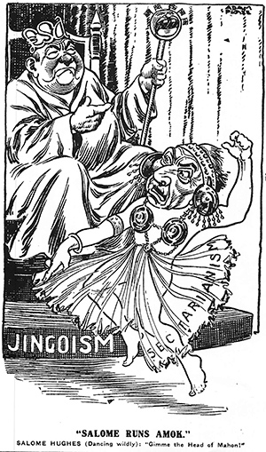 Above: ‘Salome’ Hughes in the House of Representatives demanding Mahon’s head. (Australian Worker, 18 November 1920)