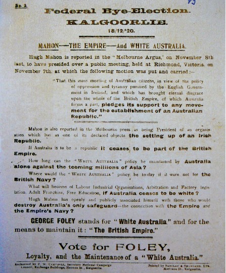 Above: ‘Loyalty, and the Maintenance of a “White Australia”’—election leaflet of George Foley, who defeated Mahon in the Kalgoorlie by-election of 18 December 1920. (Mahon Papers)