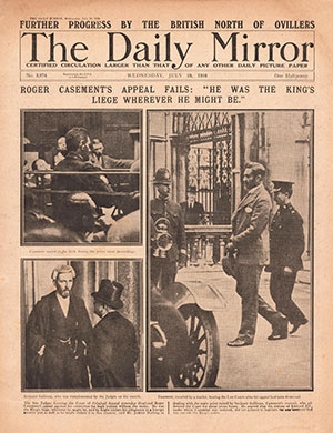 Above: The Daily Mirror’s coverage of the failure of Roger Casement’s appeal, 19 July 1916, including his defence counsel, Alexander Martin Sullivan (bottom left-hand corner). Sullivan had managed to get as sympathetic a jury as was possible in the original trial but it had no effect on the outcome. (Almy)