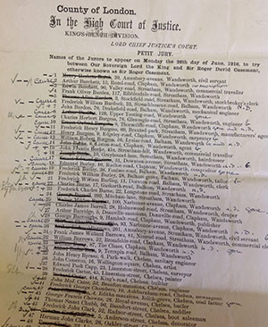 Frederick Edward Woolls, William Alfred Cox and Archibald William Scales were enlisted to knock on doors in Wandsworth, Ealing, Chelsea and other parts of London, to try to pin down the potential jurors’ political views. Sometimes, despite calling to their houses several times, they did not manage to speak to the jurors themselves but chatted with their wives or neighbours. Having spoken to as many of the potential jurors as possible, Casement’s lawyers annotated the two jury panels, marking names with pluses, minuses or question marks, depending on the juror’s position on the political spectrum.