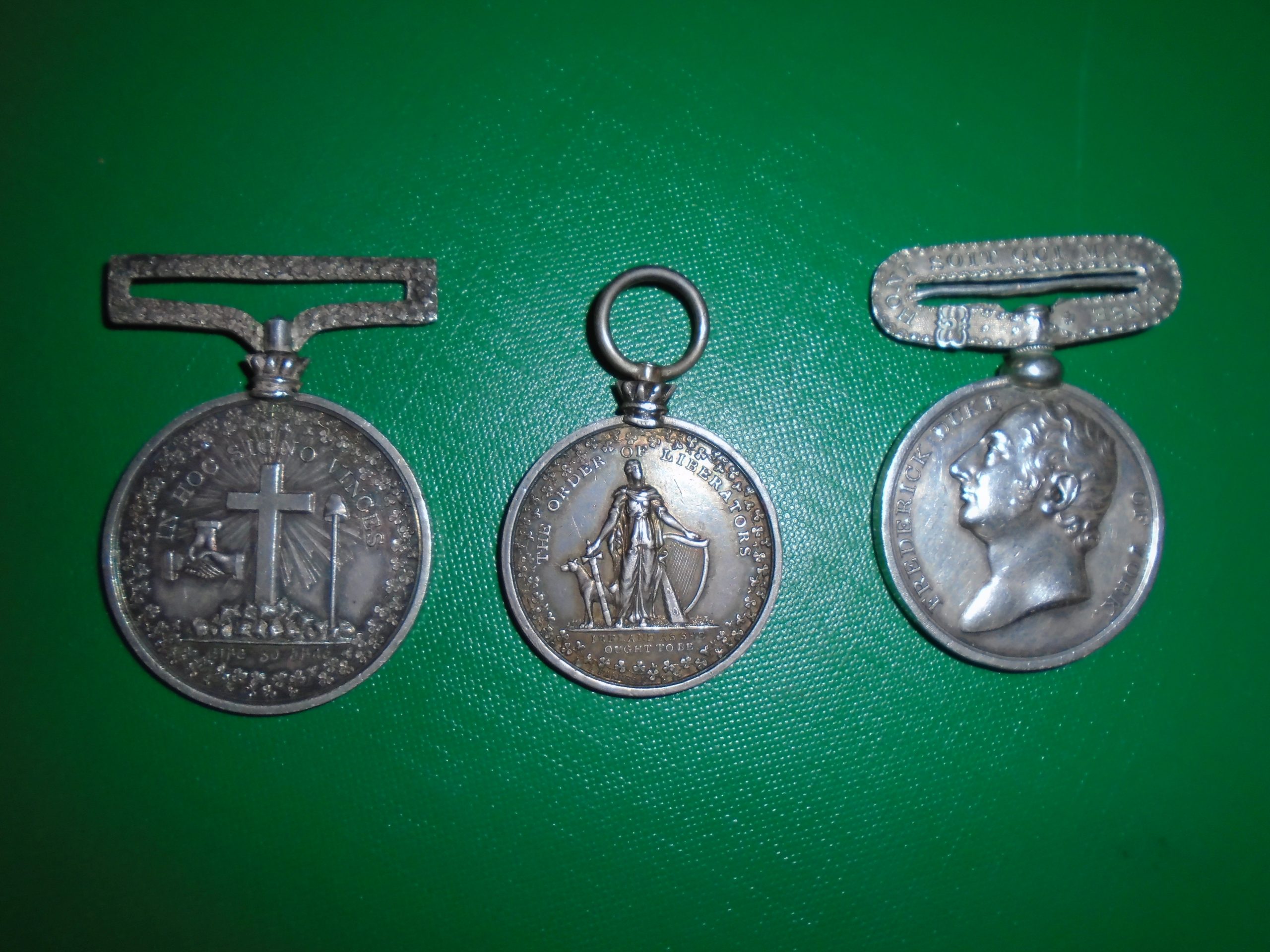 Above: Two medals by Isaac Parkes. The first two images are the front and back of an Order of Liberators medal, while the third, featuring Frederick, Duke of York, and which may have inspired the former, is from the anti-Catholic Emancipation Royal York Club.