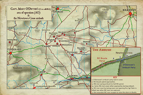 The first major event that involved Mary O’Dwyer was the Newtown ambush. An RIC bicycle patrol left the barracks in Ballinure, between Cashel and Killenaule, on the second day of every month to collect pay in Cashel. Unbeknownst to the patrol, it had been for some time under surveillance by Mary, on the orders of Comdt Tommy Donovan. She reported her information back to Donovan, and it was decided to ambush the patrol on 2 July 1920 at a crossroads at Newtown, midway between Dualla and Ballinure (see map).