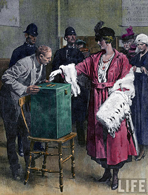 Above: An illustration by Fortunino Matania of a woman casting her vote in the December 1918 general election. Only women over 30 who were householders or wives of householders could vote. (LIFE)