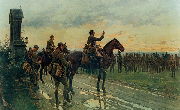Above: The Last General Absolution of the Munsters at Rue du Bois, by Fortunino Matania. Owing to residency requirements, the hundreds of thousands deployed to the war front were effectively disenfranchised. (NMI)