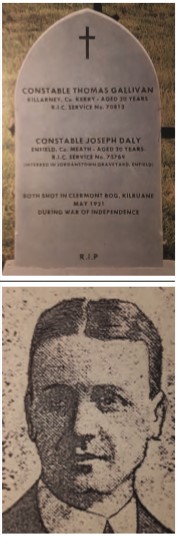 Top: A monument, erected by Cloughjordan Heritage Group in September 2019, to RIC Constables Thomas Gallivan and Joseph Daly, ‘disappeared’ by the IRA in May 1921.