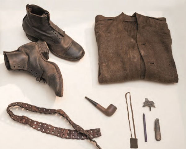 Above: The boots, cardigan, British Army cap badge and other personal possessions of suspected informer Thomas Kirby, discovered with his body in a bog at Turraheen near Rossmore in 1990 and now on display in Tipperary County Museum, Clonmel. (Tipperary Museum Collection)