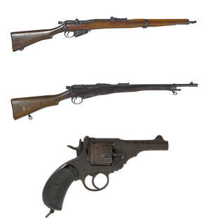 In peaceful times the RIC did not always carry their weapons when on patrol but they were always available at their barracks. The Lee Enfield carbine (left/above) with a six-bullet magazine—as against ten in the larger rifle—was in use by British army cavalry from 1896 to 1907, when it was decided to issue one common rifle to both infantry and cavalry units: the ‘short magazine’ Lee Enfield rifle Mark III (SMLE, right/below).