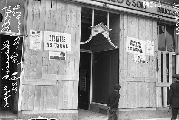Above: ‘Business as usual’—a Dublin shop boarded up as a result of damage during the Civil War. It also sums up the policy of the Irish Free State. (NLI)