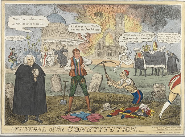 Above: ‘Funeral of the Constitution’—Isaac Cruikshank’s jaundiced view of Catholic Emancipation, with which Wordsworth would have concurred. (TCD)