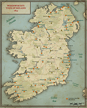 Wordsworth spent five weeks in Ireland, visiting glens, rivers, loughs, abbeys, churches, castles and demesnes, as well as Dublin, Cork, Limerick, Derry and Belfast, before returning to Britain via Donaghadee in County Down. His travelling companions were John Marshall (MP for Yorkshire) and Marshall’s son James. With these wealthy flax-spinners from Leeds, Wordsworth toured the island in a ‘carriage and four’. Along the way, he kept up with friends such as Caesar Otway and William Rowan Hamilton, and made new acquaintances, clerical, political and literary, such as the Edgeworth family in County Longford. Remarkably, the 59-year-old poet also climbed Carrauntoohil with the young James Marshall.