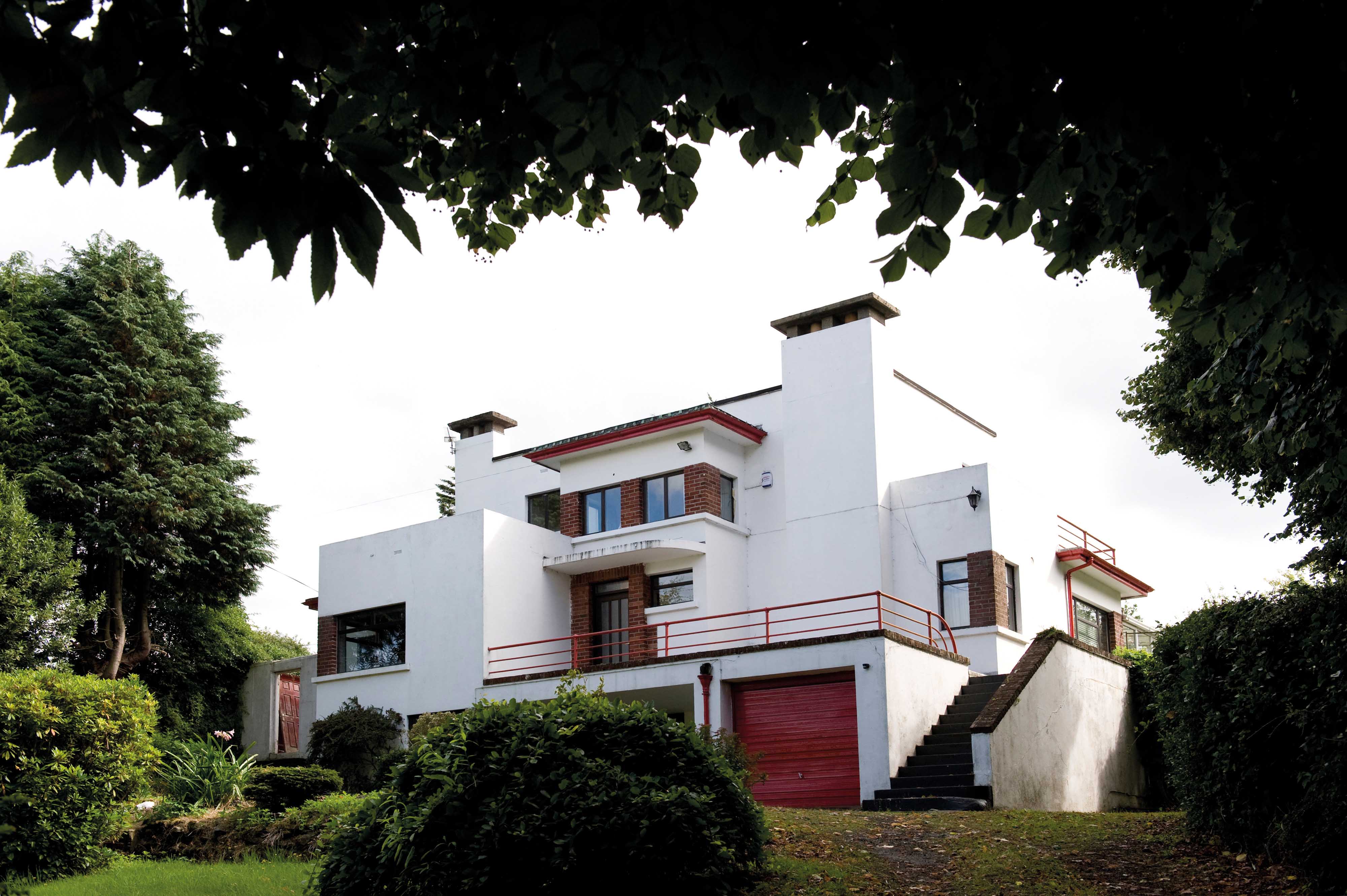 In keeping with the International Style, the outer walls were constructed using concrete blocks manufactured on site, finished with a sand-and-cement render and painted a brilliant white. The red brick dressings are ‘Ballinphellic Rustics’, pointed using cement, and are a recurring motif in Smith’s houses in Castletroy. The red accents were further defined by painting the horizontal elements—railings, fascias and gutters—with scarlet gloss paint.