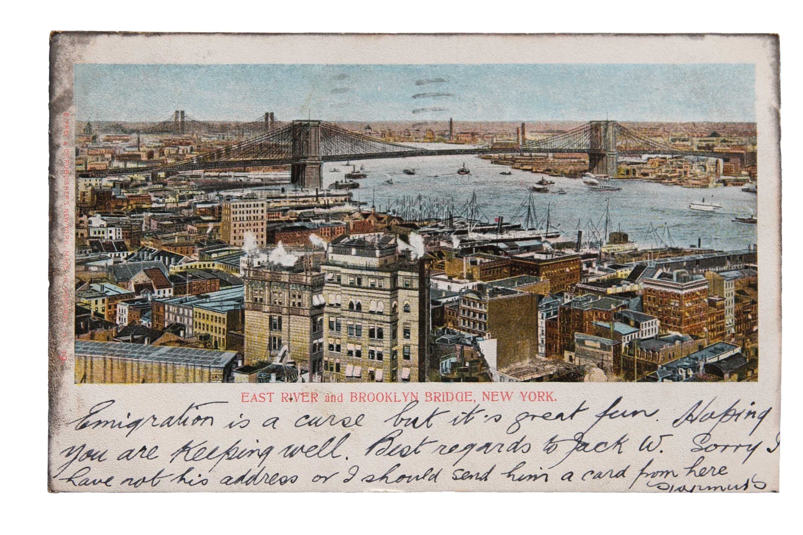Sources such as this picture postcard collection offer us insights into the major preoccupations and forces operating within Irish society at this time, and, importantly, how individuals interacted with them on an everyday level. As Judy Attfield has written, the everyday ‘is the place outside academic discourse where things are not necessarily con-veniently ordered to prevent inconceivable encounters’. So, for instance, one of Christina’s cards features an image of the Brooklyn Bridge in New York, under which her future brother-in-law has written ‘Emigration is a curse but it’s great fun’—a light-hearted if unexpected comment about what is generally considered a major Irish tragedy. The big historical picture tells us, and the writer of the card clearly knows, that mass emigration such as Ireland has experienced has been overall ‘a curse’ for the country. The small detail glimpsed via this personal communication nuances this, indicating that nevertheless, at a given point in time, for a young man in search of adventure even a great tragedy can have its fun side.